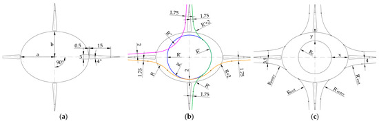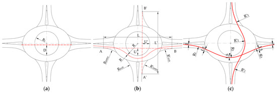 The resulting swept paths were used to determine the central island radii (Rc), circulatory roadway width along the major axis (x), circulatory roadway width along the minor axis (y), and carriageway edge design elements (Rentry, Rexit, R′entry, and R′exit). The entry width was set to 3.5 m, while the exit width was set to 4.0 m (Figure 1c).