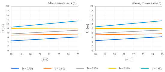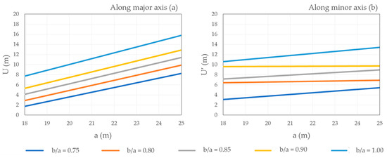 The results of the swept path analyses for the right turn and straight passage were the distances between the tangent of the entry radius and the tangent of the exit radius along the major and minor axes (L and L′) and the deflection along the major and minor axes (U and U′) given in Table 3 and Table 4. It can be noted that these distances and the deflections are proportional to the length of the major axis (a). In general, measured distances between the tangent of the entry radius and the tangent of the exit radius along the major axis (L) are larger than measured distances along the minor axis (L′). The only deviation from this behavior can be noted for a major axis (a) of 24 m and (b/a) of 0.90. At the same time, measured deflections along the major axis (U) are generally smaller than measured deflections along the major axis (U′). The only deviation from this behavior can be noted for a major axis (a) of 18 m and (b/a) of 0.75.