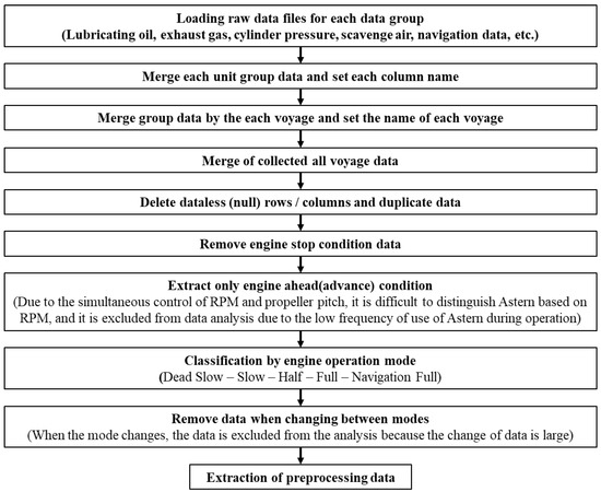 The data must be free from abnormal data to ensure the reliability of results during data analysis and machine learning. The data classification that reflects the characteristics of the target to be analyzed, such as the engine, must be clear. In addition, the reliability of data processing is essential because machine learning results are derived in a different direction from the target if factors that are not related to the abnormal data or the analysis target are included. Therefore, the data collected by the data processing algorithm, considering the control characteristics of a propulsion engine constructed in a previous study [3], were preprocessed and then classified based on the engine telegraph control mode and used in the study [3]. The data preprocessing process is shown in Figure 1.