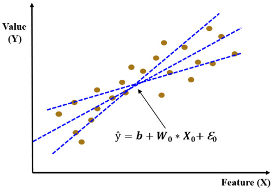 In this study, a linear regression model was used among the regression techniques. The linear regression model is the most representative analysis method among regression algorithms, and it optimizes the straight regression line that minimizes the difference between the predicted and actual values. Using the collected data shown in Figure 2, the relation between the explanatory variable (feature) and the response variable (value) was estimated linearly, and the setting of the appropriate weight (W) and bias (b) was the key to linear regression [22,23].