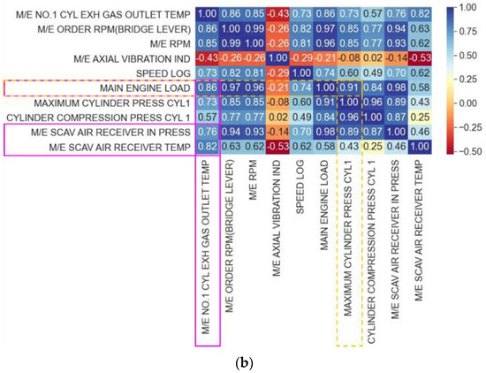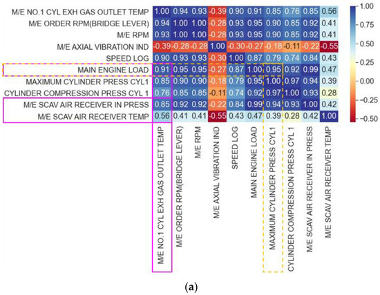 A correlation analysis of the acquired data was conducted to select the main factors necessary for MCCV correction. The Pearson correlation coefficient used in the correlation analysis is a quantification of the linear correlation between variables X and Y. It is obtained covariance of two variables divided by the product of each standard deviation, and it is a correlation coefficient commonly used in various categories [35,36]. Figure 3a shows the result of a repeated correlation analysis of the data acquired in all sections of the engine control telegraph based on cylinder 1, excluding factors that are not related to or have little correlation with engine combustion. The factors necessary for the MCCV correction were first selected by analyzing the correlation between the CET and the maximum CCP, which are the calculation factors for the MCCV, and other data. Then, a secondary correlation analysis was performed using only the data of the navigation full mode section, which is the criterion for determining anomalistic symptoms; the results are shown in Figure 3b. In the results of the correlation analysis in all operation modes, as a factor that drastically affects CET in the case of propulsion engine scavenging air temperature and pressure, the correlation coefficient of the scavenging air pressure was high at 0.85, and the correlation coefficient of the scavenging air temperature was low at 0.56. However, in the navigation full mode, the scavenging air temperature showed a high correlation of 0.82, and the scavenging air pressure was 0.76, which is lower than the result of the correlation analysis under all operation modes.