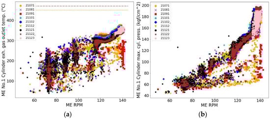 Figure 4 shows the exhaust gas temperature and maximum combustion pressure in all voyages, including the anomaly data of cylinder 1. It increases with increasing RPM of the engine, and the exhaust gas temperature and combustion pressure in the same RPM section change considerably depending on the operating environment, such as the engine load.
