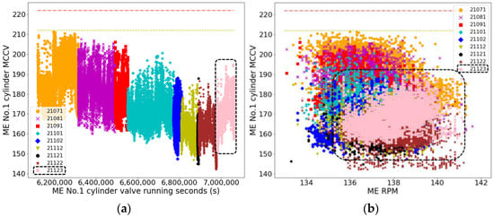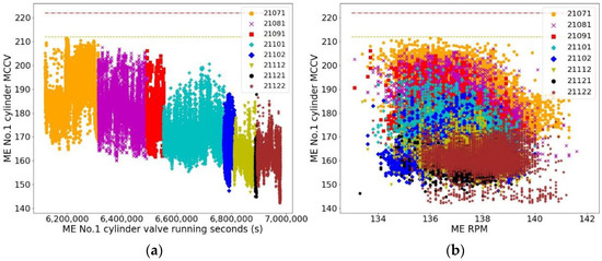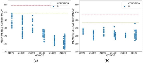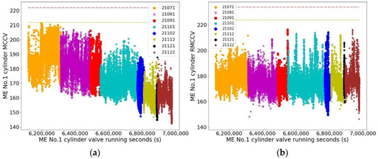 Figure 5 shows the MCCV data of cylinder 1 in a normal operating state for each voyage based on the running time and RPM. The MCCV tended to decrease owing to changes in the navigating environment, such as changes in ME ORDER RPM and the lowering of the scavenge air temperature with the progression of the voyage. The yellow dotted line in Figure 5 is the Concern (1) level, and the red dashed line is the Abnormal (2) level.