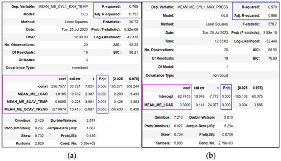 Figure 7a shows the results of the regression analysis of the exhaust gas temperature and MCCV correction factor of cylinder 1. The engine load (ME LOAD), scavenging air temperature (ME SCAV. AIR RECEIVER TEMP.), and scavenging air pressure (ME SCAV. AIR RECEIVER IN PRESS.) were determined as correction factors considering the explanatory power with CET and the influence of engine combustion. The R2adj of CET and three correction factors was 0.757, showing significant explanatory power. In addition, the p-value (p > ∣t∣), which is used to evaluate the effect of each correction factor on the CET, is <0.05 for all three correction factors. In addition, MAE, which is a predictive index of CET according to the correction factor, was 4.685, and the selected correction factor was found to be significant.