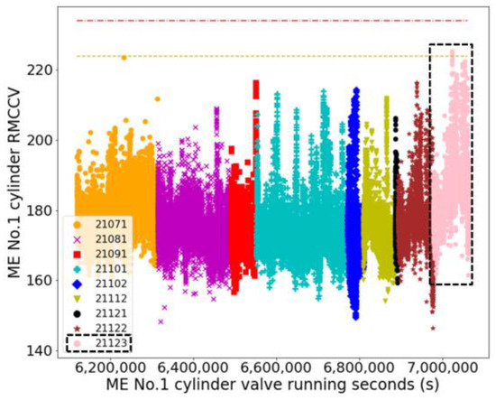 Figure 10 shows the RMCCV results of all data, including voyage 21123 data with anomalies. The RMCCV of voyage 21123 increases over time. However, clearly determining anomalistic symptoms is difficult due to the noise data.