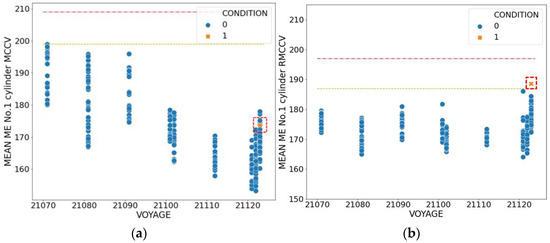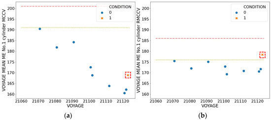 Figure 6 shows the results of applying the entire dataset containing voyage 21123 data with anomalies to the MCCV based anomalistic symptom determination algorithm. Because the maximum MCCV for cylinder 1 was 211.5, the concern level was set to 212–222, and the abnormal level was set to more than 222. Figure 6a shows the results based on the running time of the propulsion engine. The MCCV of voyage 21123 with abnormalities tends to increase with the operating time. However, the abnormalities could not be determined from the results of this algorithm, as they tend to appear in the range below the concern level of the MCCV. Figure 6b shows the results based on RPM; the data of voyage 21123 with anomalies were located at the bottom of the steady state data group. In addition, determining anomalistic symptoms was impossible because of the difference between the concern level criteria of the MCCV. Anomalistic symptoms cannot be detected based on the MCCV set owing to changes in the normal operating range of the MCCV caused by major factors, such as weather conditions, the marine environment, and constant speed navigation target RPM, which differ for each voyage.