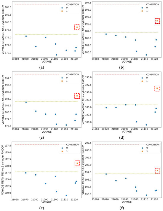 Figure 13 presents the detection results of anomalistic symptoms in all cylinders based on VOYAGE averaged data. Voyage 21123 data displayed anomalistic symptoms in all cylinders. This confirms the efficacy of the RMCCV based algorithm in determining engine anomalistic symptoms and validates the effectiveness of the constructed algorithm.