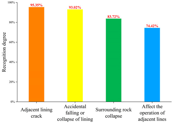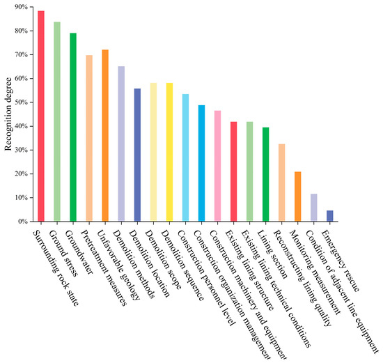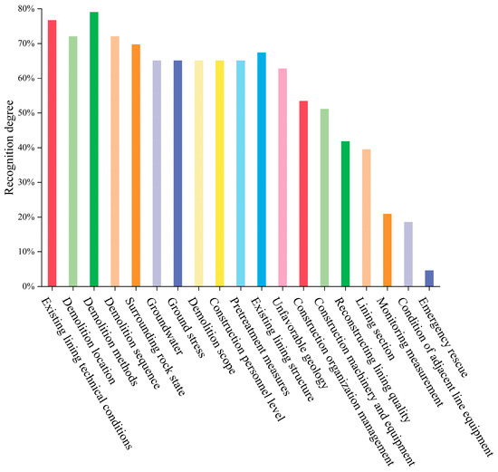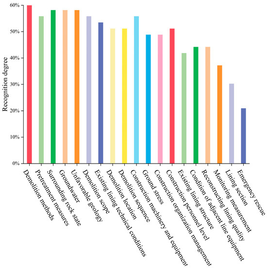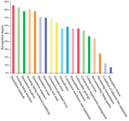 In order to further determine the risk events and risk factors of tunnel lining demolition construction, a questionnaire was sent to experts in the industry to obtain more practical results. Through two rounds of questionnaires (see Appendix A for details), the following 65 valid data were obtained, including 23 valid data in the first round and 42 valid data in the second round. Through the first round of questionnaires, the results are shown in Figure 1. It is concluded that the risk events of tunnel lining demolition construction mainly include adjacent lining cracks, accidental lining falling or collapse, surrounding rock collapse and affecting the operation of adjacent lines. Among them, the cracking of adjacent lining refers to the damage to adjacent structures caused by lining removal. Accidental falling or collapse of the lining refers to the accidental falling of the lining during the removal process, resulting in personal injury and equipment damage. Surrounding rock collapse refers to the collapse of surrounding rock during lining removal, resulting in casualties, equipment damage, and cost increases. The impact on the operation of adjacent lines refers to the damage to the structure and equipment of adjacent lines caused by the removal of lining and the failure of normal operation. Through the second round of questionnaires, the risk factors corresponding to the possible risk events in the tunnel lining demolition construction are obtained, as shown in Figure 2, Figure 3, Figure 4 and Figure 5. After comprehensive analysis, the tunnel lining demolition indicators are shown in Figure 6.