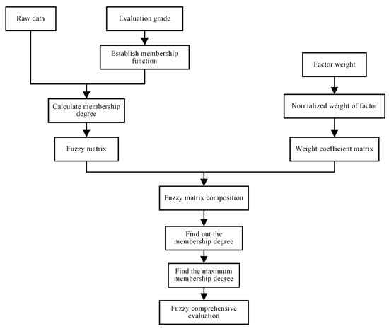 The basic idea of the fuzzy comprehensive evaluation method is to decompose the influencing factors based on the evaluation objectives, construct different levels of indicator systems, assign values to these indicators and determine weights, and finally use the evaluation model to calculate the evaluation values, which are then sorted and evaluated [35,36]. On the basis of determining the evaluation criteria and weights of evaluation factors and factors, the principle of fuzzy set transformation is applied to describe the fuzzy boundaries of each factor and factor using membership degree. A fuzzy evaluation matrix is constructed, and the reliability of the evaluation object is determined through composite operations [37]. The specific process is shown in Figure 7.