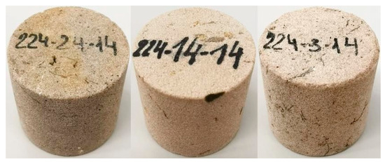 In this study, samples of consolidated sandstones (clastic rock) confined to the Visean stage of the Lower Carboniferous deposits are used as a medium through which the fluid is filtered (Figure 1). The rock was extracted from a depth of 2 km during drilling with the coring of production wells at an oil field in the Perm Territory (Russia). The field has low reservoir pressure near the wells (below the saturation pressure of oil with gas), as a result of which oil degassing already occurs in the reservoir. The consequence of this is also the release of paraffins and asphaltenes from the oil, which block the rock in the near-wellbore zone of the reservoir during oil filtration into the well. When preparing the plugs, the API [36] standard was used, according to which the samples were drilled perpendicular to the core, i.e., parallel to the bedding, extracted on a Soxhlet apparatus, and dried.