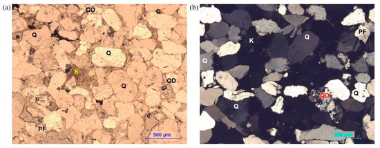 The microstructure of the sandstone obtained in transmitted light using crossed-nicol methods: (a) a fragment of a thin section with no analyzer used; (b) a fragment of a thin section with an analyzer used; Q is denoted to quartz, PF is denoted to potassium feldspar, QD is denoted to quartzite debris, and K is denoted to kaolinite.
