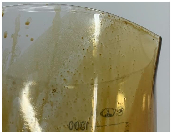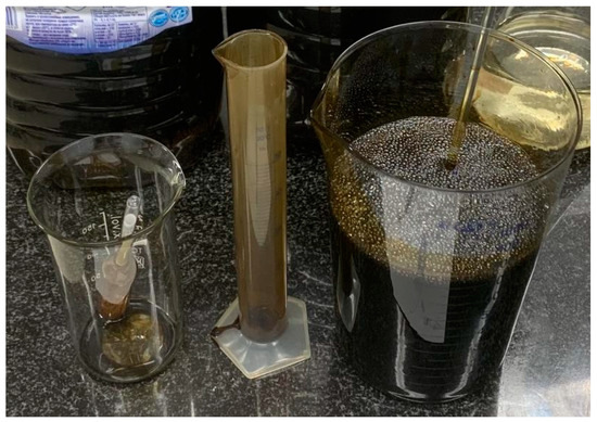Crude oil containing paraffins and asphaltenes, obtained from wells in the same field as the samples, was used as a filtered liquid (Figure 3). The oil was additionally mixed to release residual associated gas. The density and dynamic viscosity of oil, measured at room temperature at 22 °C, were 836 kg/m3 and 3.3 mPa × s, respectively, which is generally regarded as relatively light. The black color of oil is a characteristic of the majority of mature oil and gas fields in the Volga-Ural oil-bearing province and is associated with the presence of oil resins in addition to paraffins and asphaltenes.