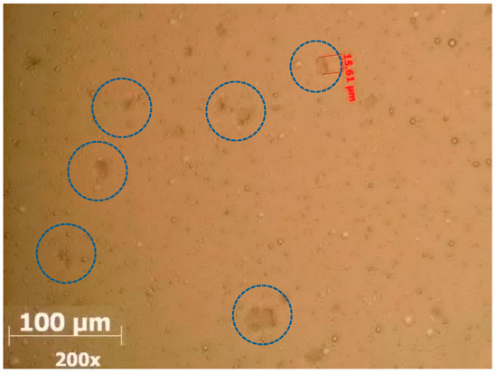 The weight content of paraffins and asphaltenes in crude oil is 4.57% and 0.56%, respectively. The presence of paraffins and asphaltenes in the crude oil was established in the laboratory of chemical analysis as well as by light microscopy, according to which paraffin substances combine and reach 40 μm. Paraffin formations 15 μm in size are distinguished, as marked in Figure 4.