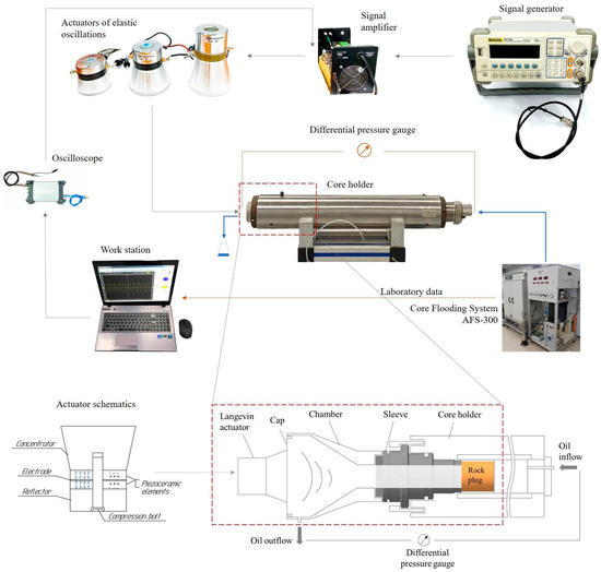 Among state-of-the-art studies, 2D micromodels gain ground due to the visibility of the process. Using such a model, ultrasonic waves with a frequency of 20 kHz are able to remove the pore space from deposited asphaltenes, and the amount of removed asphaltenes increases with increasing treatment time (sonication) [32]. The authors also showed that the geometry of the pore space significantly affects the efficiency of ultrasonic treatment. Using a micromodel with an ultrasonic device, the oscillations reverse asphaltene deposition on the pore wall and remove asphaltenes from the pore channel, increasing oil production [33]. Micromodels allow one to visually demonstrate the influence of a nonlinear load in a flat, artificially porous medium. At the same time, the pore space of the rock is much more complicated, and therefore it is of particular interest to evaluate the effect of nonlinear loading on a conventional core sample.