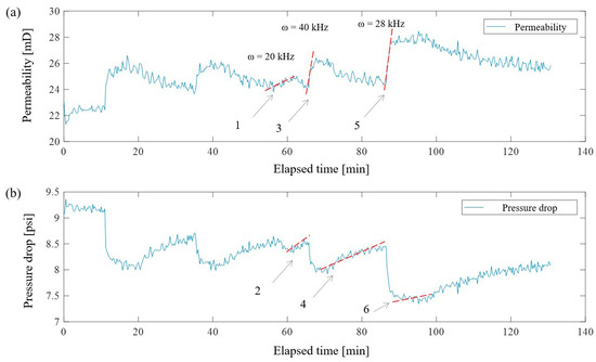 Graphs of changes in filtration parameters during the use of distilled water in the presence of residual oil: (a) permeability; (b) pressure drop. Segments 1, 3, and 5 correspond to sample treatment at 20 kHz, 40 kHz, and 28 kHz; sections 2, 4, and 6 correspond to turning of treatment and restoring filtration.