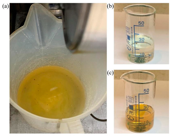 Displaced residual oil from the sample during water injection: (a) colored distilled water and oil droplets at the outlet of the sample; (b) a solvent (gasoline) before washing the rig parts; (c) a solvent after washing the rig parts.
