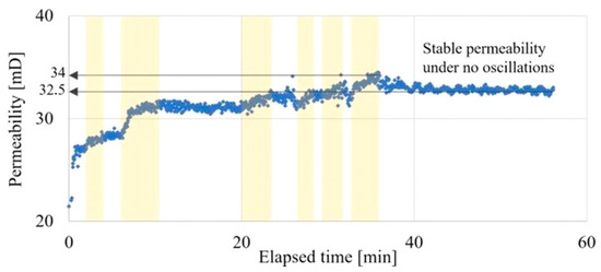In an experiment on a rock of low permeability, the nonlinear loading was less effective. The initial permeability of the sample was 35 mD. Despite periodic recovery, the permeability still decreased to 30 mD (Figure 13). At the beginning of the experiment (up to 20 min), the flow rate was set on a sample of medium permeability, and an intense decrease in permeability was observed. The explanation for this effect was a more intense blocking of the pore space of the sample, associated with a smaller cross section and the number of pore channels, at the same linear rate of oil filtration through the sample. To create conditions similar to those of the medium permeability sample, the oil flow rate was reduced to 0.28 mL/min, so the linear oil filtration rate was proportional to the oil filtration rate in the high permeability sample.