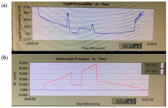 It can be seen that artificial variable loading removes most of the pressure drop caused by pore blocking and restores permeability. At the same time, up to 110 min, a slight trend towards pore blocking is observed. The effect of changing the frequency from 40 kHz to 20 kHz on the filtering mechanism is clearly observed. Combining exposure at frequencies of 40 kHz and 20 kHz, a decrease in pressure drop and restoration of the sample permeability to the initial value of 420 mD (Figure 14b) were achieved, although during the experiment the permeability decreased to 340 mD.