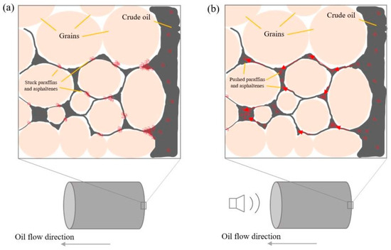 In the case of the activation of variable loading, elastic vibrations propagate through the sample matrix and lead to its elastic deformation (high-frequency, low-amplitude compression and expansion). The resulting vibration leads to the relative motion of the rock walls and the paraffins and asphaltenes located in the constrictions. As a result of relative motion, paraffins and asphaltenes are compacted and pushed by the flow of filtered oil deep into the sample. On their further path, paraffins and asphaltenes enter new pore channels and can either block them (if the pore throat size is much smaller than the size of paraffins and asphaltenes) or be filtered without restrictions or influence on permeability (Figure 17b).