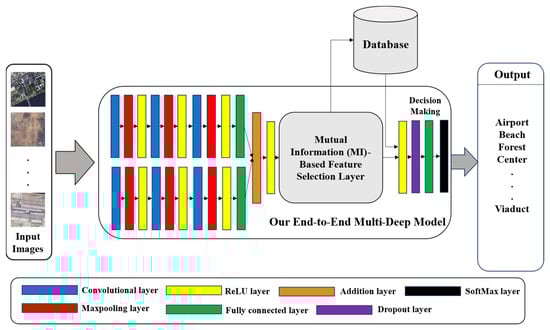 Our methodology centers on the innovative concept of single-input multimodal fusion for scene recognition, departing from traditional single-modal approaches. Figure 1 shows the block diagram of the proposed multi-deep model for scene recognition. As shown in the figure, the input images are fed directly to the proposed multi-deep model. Then, the features are extracted from the first fully connected layer and fused using an addition technique. To optimize feature representations, we employ MI-based feature selection. These refined features are then incorporated as an additional layer into the model, and recognition is performed using the SoftMax layer. An additional layer in the model greatly improves scene identification feature relevancy. Through a systematic evaluation of feature significance and selection of the most relevant features, we can improve model accuracy and efficiency by lowering feature space dimensionality. This approach harnesses synergistic information from multiple modalities, improving feature quality and scene recognition performance. All steps of the model are discussed in the following subsections.