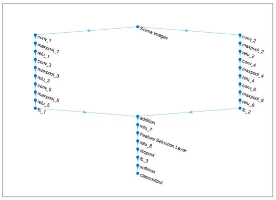 One of the notable features of this architecture is the incorporation of two parallel pathways for feature extraction. These pathways allow for the simultaneous processing of multimodal data. By integrating features from diverse modalities at an early stage, the model can effectively capture complementary information, enhancing its scene recognition capabilities. The architecture employs an ‘additionLayer’ (‘addition’) to merge features from both pathways, followed by an additional ReLU layer. This fusion step is pivotal for effectively combining the extracted features from different modalities. Subsequently, a ‘Feature Selection Layer’ (‘Feature Selection Layer’) introduces a critical element of feature selection. This layer, which follows the ReLU activation, uses a fully connected layer with 600 units to select the most relevant features from the fused representation. Feature selection is a crucial mechanism for enhancing the model’s interpretability and reducing computational complexity. After feature selection, a dropout layer (‘dropout’) helps prevent overfitting by randomly deactivating a portion of the selected features. Following this, another fully connected layer is responsible for mapping the feature representation to the output space, and a SoftMax layer (‘softmax’) produces probability distributions over scene categories. Finally, the ‘classificationLayer’ (‘classoutput’) assigns scene labels based on the probability distribution, facilitating scene recognition.