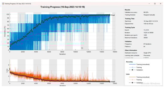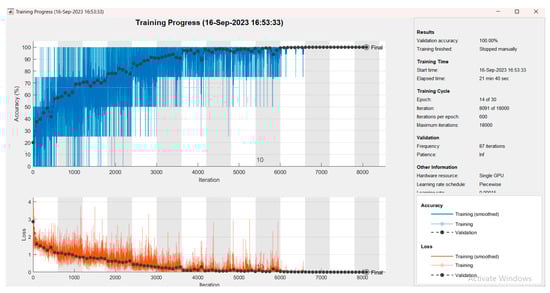 The architecture’s training is guided by specific options, including the choice of the Adam optimizer, mini-batch size, maximum epochs, and learning rate scheduling. Training progress is visualized using training plots, and the model’s performance is validated using a separate validation dataset. All hyperparameters are listed in Table 2.