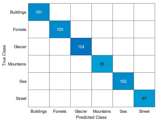 The confusion matrix presented in Figure 6 provides a detailed breakdown of the classification performance of our scene recognition model on the test sets across six distinct scene categories: Building, Forests, Glacier, Mountains, Sea, and Street. From the figure, the model achieved perfect classification, with all 101 samples correctly identified as such for the Building class. Similarly, the Forests class also yielded perfect classification, with all 103 samples correctly identified. The Glacier class exhibited impeccable performance, with all 124 samples correctly classified. For the Mountains class, the model achieved a high level of accuracy, with 83 out of 83 samples correctly classified. The Sea class was also accurately recognized, with all 102 samples correctly classified. In the Street class, the model displayed strong performance, with 87 out of 87 samples correctly classified.