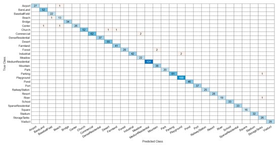 Figure 8 shows the confusion matrix of the proposed method on the test sets of the second database. From the figure, we can observe that the Airport and Beach classes displayed a relatively high level of misclassification, with 27 out of 28 images for the Airport class and 13 out of 14 images correctly identified from the Beach class. However, one sample was incorrectly classified as Beach for the Airport class and was incorrectly classified as BaseballField for the Beach class. Further investigation may be required to address this misclassification. The Center class exhibited accurate classification for most samples, with 26 out of 28 samples correctly identified. Nevertheless, one sample was misclassified as BareLand and one sample was incorrectly classified as Beach. In the Church class, the model demonstrated strong performance, with 52 out of 54 samples correctly classified. Two samples, however, were misclassified as Desert and FarmLand. The Commercial class achieved excellent results, with 62 out of 64 samples correctly identified. Two samples were incorrectly classified as Meadow. Also, the Forest class achieved a good result with only two samples being incorrectly identified as Mountain. In the Parking and River classes, most samples, 61 out of 62 for Parking and 19 out of 20 for River, were correctly classified. One sample, however, was misclassified as Storage Tanks in both classes. The remaining classes were all classified correctly without any misclassifications.