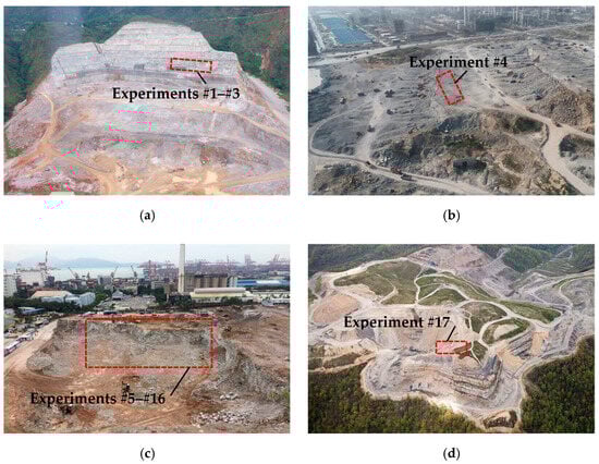 To investigate the fractal characteristics of blasting fragments, a total of seventeen deep-hole bench blasting experiments were conducted at four quarries. The test locations in each quarry are depicted in Figure 1, and the blasting parameters for each experiment are presented in Table 1. The primary physical and mechanical parameters of the rock mass within the experiment areas are presented in Table 2.
