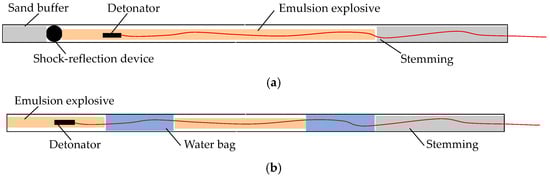 Typical charging construction for the field blasting experiments: (a) blasting with shock-reflection devices; (b) water-decked blasting.