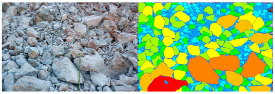 Drilling and blasting are the initial processes of the mine-to-milling sequence, and the properties of blasting fragments significantly affect the overall production costs of mine-to-milling processes [1,2,3]. Studies have indicated that the particle size distribution, shape, and specific surface area (SSA) are fundamental attributes of blasting fragments, which affect the energy utilization efficiency of downstream crushing equipment [4,5,6]. Therefore, investigating the fundamental attributes of blasting fragments has theoretical significance for clarifying the mechanism of rock blasting fragmentation and optimizing the energy efficiency throughout the mine-to-milling process.