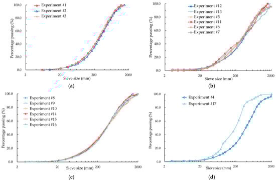 Blasting fragmentation distribution curves for each experiment: (a) experiments #1–#3; (b) experiments #5–#7 and #11–#13; (c) experiments #8–#10 and #14–#16; (d) experiments #4 and #17.