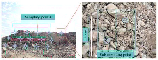 After the blasting experiments, a certain number of blasting fragments were randomly collected from muck piles for indoor shape parameter measurement experiments. The top, middle, and bottom of the muck piles each had five uniformly distributed sampling points. Approximately equal quantities of fifteen fragment samples were extracted from each subsampling point, forming a bulk sample group. The distribution of sampling points in the upper, middle, and lower layers of the muck pile, as well as the subsampling points within the sampling points, are illustrated in Figure 5.