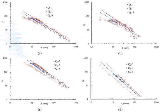 Power-law fractal distributions of blasting fragments obtained via the particle size–frequency method: (a) quarry Q1; (b) quarry Q2; (c) quarry Q3; (d) quarry Q4.
