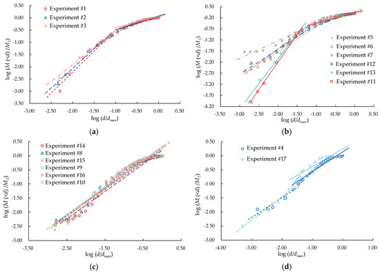 Relationship between the particle size and cumulative mass of blasting fragments in different quarries: (a) quarry Q1 (experiments #1–#3); (b) quarry Q3 (experiments #5–#7 and #11–#13); (c) quarry Q3 (experiments #8–#10 and #14–#16); (d) quarries Q2 (experiment #4) and Q4 (experiment #17).