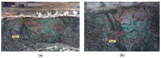At quarry Q3, high-speed photography using the Phantom Veo710l camera was employed to monitor the granite-rock-blasting fragmentation process multiple times. The setup of the high-speed camera is illustrated in Figure 9. Through a comparative analysis of high-speed images of the bench surface before and after blasting, the macroscopic crack distribution on the bench surface was determined, as shown in Figure 10.