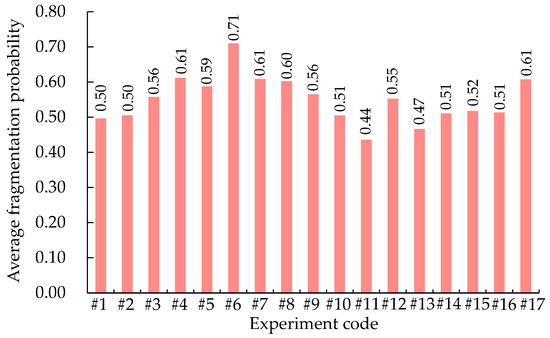 As shown in Figure 10, under the action of explosive energy, the rock of the bench surface underwent multistage fragmentation, with each stage resulting in smaller fragments of similar shape. According to fractal models such as the Sierpinski carpet, it can be learned from the macrocrack distribution in Figure 10 that the blasting fragmentation process of granite rock underwent two or three stages of fragmentation, with each stage involving a division into smaller fragments with similar shapes and a division factor of 2. This finding implies a fragmentation similarity ratio of 0.5, and the number of secondary fragmentation units was 8. Accordingly, the average blasting fragmentation probability for each experiment was calculated using Equation (11), and the results are shown in Figure 11.