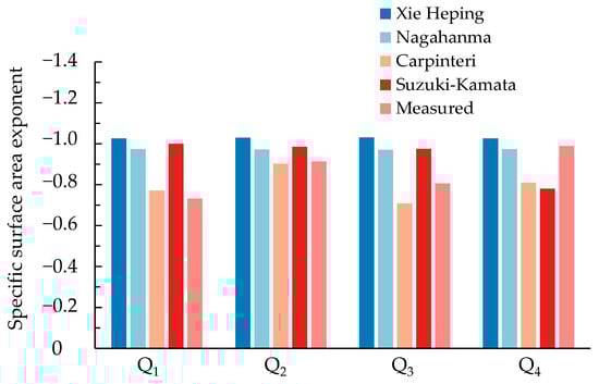 The exponents in Equations (13) and (15)–(17) can be regarded as the SSA exponents of rock particles. Detailed measurements and values of Ds and SSA for the blasting fragments randomly collected from the four quarries are presented in references [3,40]. Using the mean particle size distribution fractal dimension D and fragmentation fractal dimension DF reported in Section 3.1 and Section 3.2, the SSA exponents of blasting fragments randomly collected from the four quarries were computed using Equations (13) and (15)–(17). The results are shown in Figure 12.