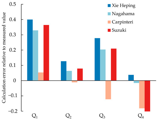 As shown in Figure 13, the SSA exponents calculated using Equation (16) and the fragmentation fractal dimension DF exhibited the smallest differences from the measured values. Additionally, the findings presented in Section 3.3 indicate that the fragmentation fractal dimension is closely related to the probability of blasting fragmentation, which is associated with the newly generated surface area during the fragmentation process. Hence, the SSA, fragmentation energy, and energy utilization efficiency calculated according to the fragmentation fractal dimension align more closely with practical observations.