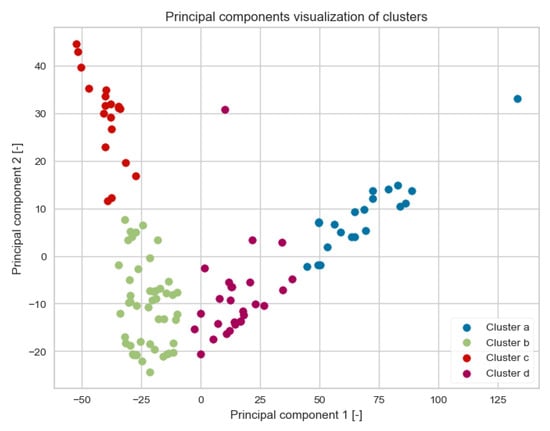 Clustering techniques are useful in identifying subgroups in all spatial dimensions. Its ability to group points into compact and separate clusters can help reveal underlying structures in the data and identify groups of similar points in a multidimensional space. Thus, the K-means algorithm is a valuable tool in the exploration and analysis of unlabeled data, facilitating pattern understanding and decision making based on the intrinsic structure of the data. For the choice of the number of clusters, the Jambu elbow technique is used (see Figure S2), where it is observed that there are four clusters before the inertia of the cluster decreases considerably []. Figure 1 shows the distribution of each of the clusters using principal component analysis (PCA), which projects each of the dimensions on the principal planes of the data. In general, orthogonal behavior formed between the four groups of points is observed, indicating that the data are distributed heterogeneously among each dependent variable, i.e., some formulations favor only tensile stress or elongation at break (purple and blue) and others favor in between (green and red). In addition, the figure allows the agglomerability of the groups to be evaluated, and good agglomeration of the data is observed, with the exception of some points that escape the average of the rest of the group.