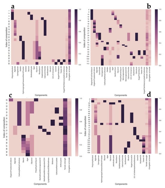 Now, a relevant point of study for materials developers is to identify components that allow desirable properties in terms of their specific application. As shown in Figure 2a–d, the formulations are represented in each of the clusters in these heat maps, where each combination (row) of the described components is presented on the x-axis (columns), and the intensity of the color represents the relative value between 0 and 1 of the concentration of the corresponding component (normalization is only for visualization). It can be observed that the last two columns are reserved for the dependent variables’ tensile stress and elongation at break. That is, the heat map is like a large table where each row represents a different formula for making the bioplastic film and each column represents the specific ingredients one is using. The cells in the table indicate the concentration of the ingredient, except for the last two columns as mentioned. If we analyze the intensity levels with respect to the other clusters, they can be classified as follows:
