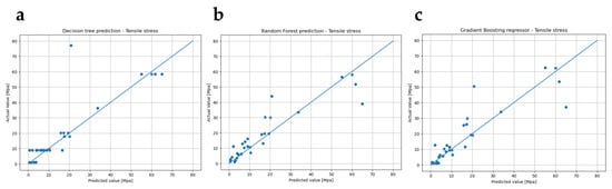 Then, for simplicity Figure 3 shows (a, b, c) the tensile strength prediction graphs for each of the models used. If we use the decision tree model as a reference, the random forest model has an effect on decreasing the variance of the model [], while the gradient boosting model puts more emphasis on the reduction in bias [,].