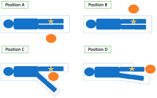 A right-handed surgeon, 180 cm tall and weighing 75 kg, with an arm length of 73 cm from the shoulder to the tip of the third finger, performed a simulation of a left-knee replacement in each defined position (A, B, C, and D) on a patient, 189 cm tall and weighing 95 kg, on an operating table with fixed tabletops (OPT/80, OPT SurgiSystems, Calliano, Italy), 200 cm long, in an operating room. For position C, the table allowed abduction of the unoperated leg. The working height was set at the beginning of the simulation (72 cm) as a comfortable working height for the surgeon’s height, with the patient’s knee in maximum flexion. The height of the table (as is usual in the operating theatre) was not modified during each simulation.