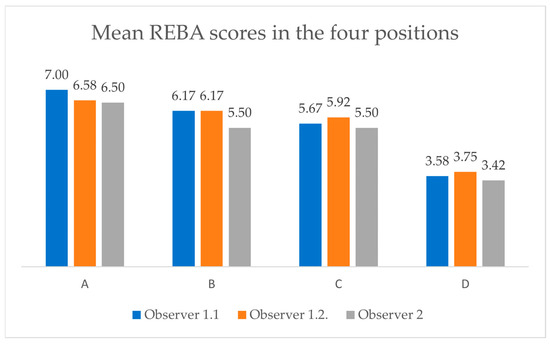 Table 4 shows the overall scores obtained by each observer using the REBA method. We found statistically significant differences between the REBA scores for the B position.