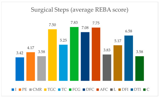 Figure 3 shows the results obtained after applying the REBA method. The position with the least ergonomic risk for the surgeon is option D, where the surgeon faces the operated knee. The lowest postural risk would be D < C < B < A. Based on the average REBA score of all their measurements, the surgical steps with the highest ergonomic risk were the TCG, the FCG, the DFC, the AFC, and the DTI (Figure 4).
