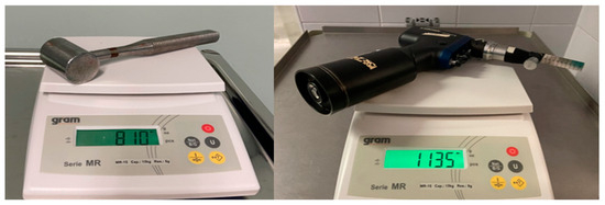 The heaviest surgical material used during total knee arthroplasty surgery. The weight of both tools is shown in milligrams.