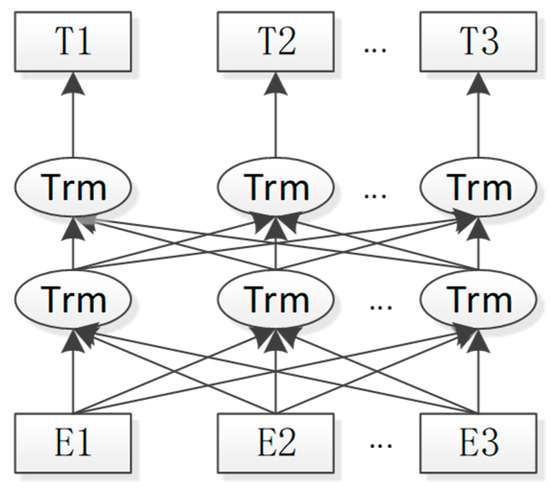 Bidirectional Encoder Representation from Transformers (BERT) [12], as the name suggests, is the Encoder representation of bidirectional Transformers that models polysemy by learning embedding forms of each word through a large number of corpora to learn context-independent semantic vector representations. The architecture of the BERT model is shown in Figure 1, where Trm represents the encoder structure in the Transformer, meaning that the BERT model is mainly composed of multiple encoder parts of Transformers.