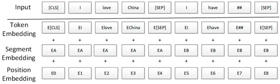 Where the Position Embedding represents a position vector, and unlike the Transformer model, the position vector in BERT is determined by model learning. The Segment Embedding is employed to distinguish between two sentences in an LSP task in the pre-training stage. The Token Embedding can be used for subsequent classification tasks. The [CLS] token that can be understood as a vector representation of all input features is the first word of the Token Embedding; The [SEP] is an identifier for distinguishing different sentences.