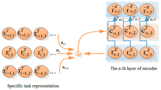 The layer perception attention mechanism can determine the importance of information in the pre-training model to the current layer, so as to obtain contextual knowledge that is more suitable for the current layer through . Similarly, the attention to information of each hidden state in the same layer is different from each other. Therefore, a context gating mechanism is adopted to control the fusion rate of each hidden state, that is, the representation from is fused into the corresponding state of , and the calculation formulas are as follows: