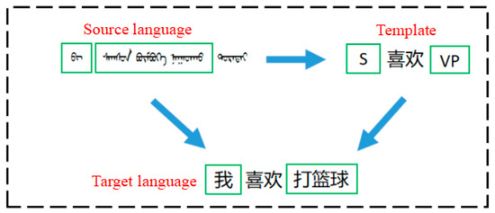 Example of Template-Guided Model Translation. The Mongolian language in the picture means “I like playing basketball”. Through the guidance of the template, the target Chinese language is finally obtained. S represents the subject and VP represents the verb phrase.